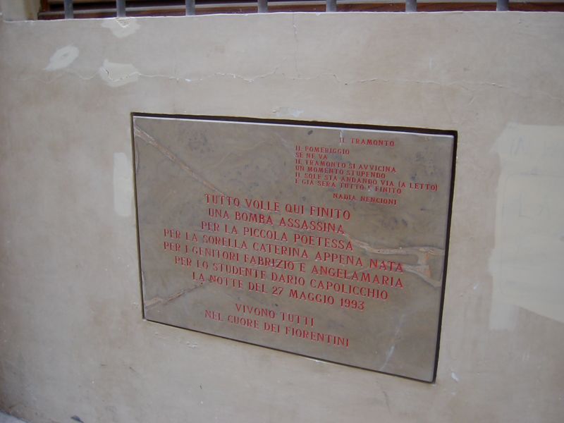 17:34:38 A plaque marking where a Mafia bomb killed a little girl a few years ago. It's very sad - they included a poem she had written a few days beforehand. |