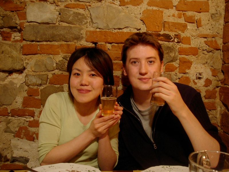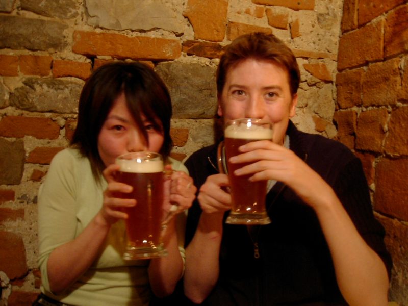 20:48:09 Me (looking a bit girly for some reason) and Chie enjoying our beers. We'd been given a table in a funny little alcove which was very cosy, but did feel a bit like we were eating in the cellar. |