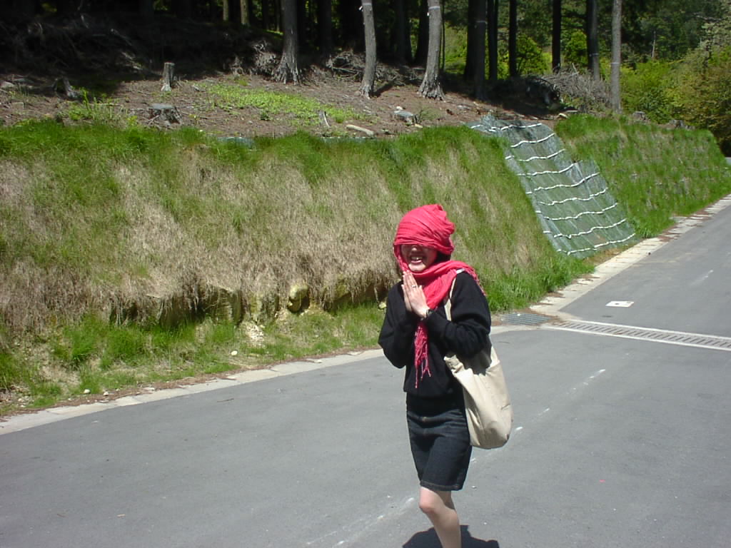 12:30. On the way to the car, Chie tried a variety of head dresses. |