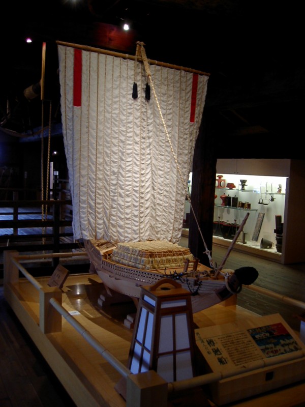 A model of a boat used to carry sake - you can see lots of little barrels on it.