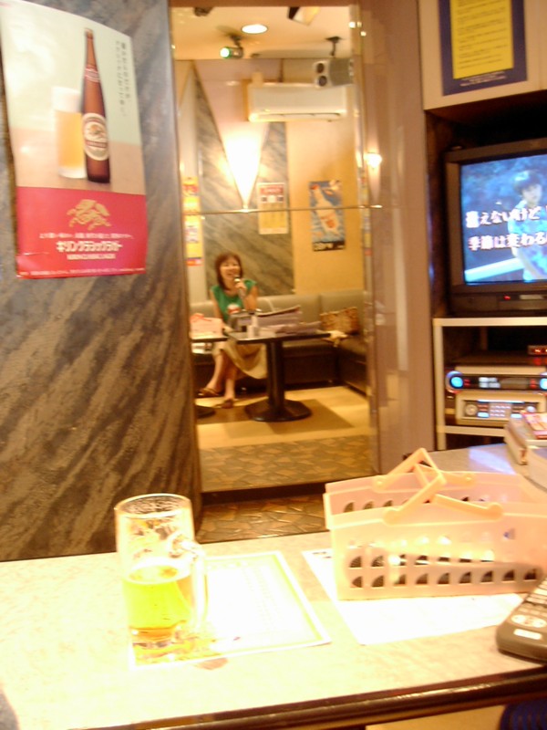 Chie in the mirror. Note my beer here - I at least started karaoke completely sober... but a beer was offered and I felt compelled to say "Yes".