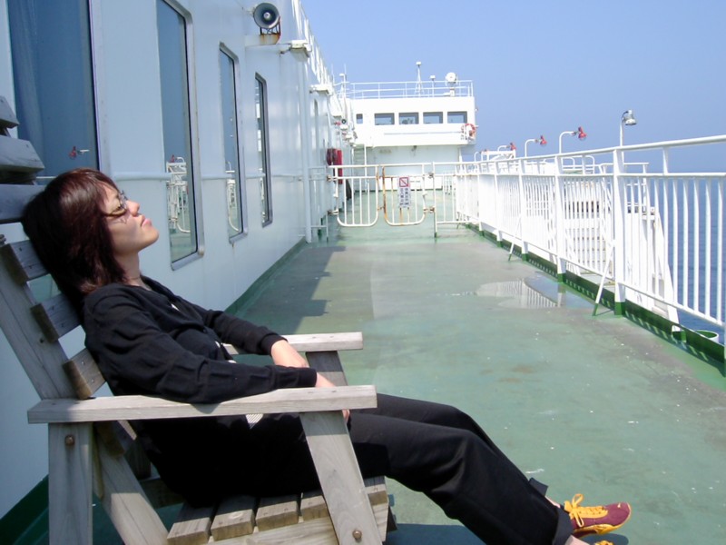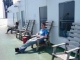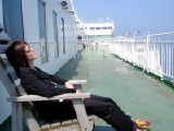 Chie relaxing on a deck chair - a proper one (i.e. it is actually on a deck)!