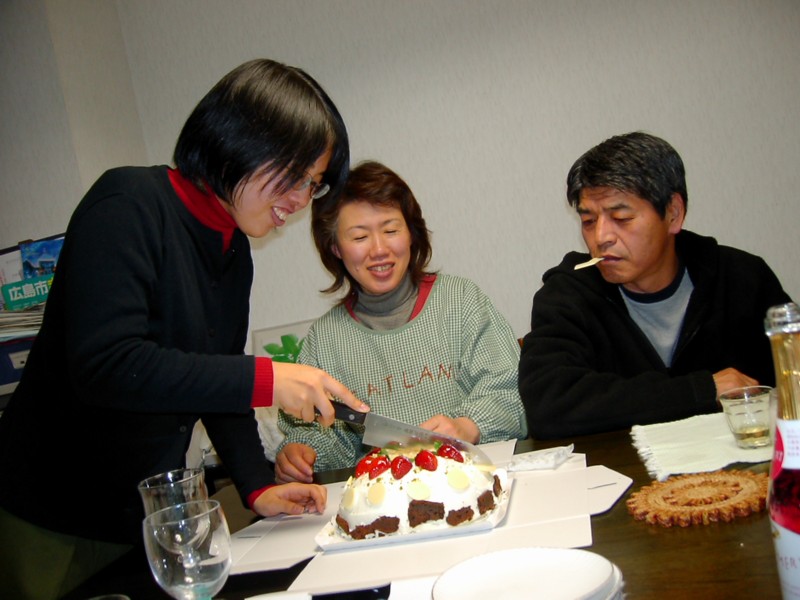 21:34:25 Chie's sister Yuka cutting the Christmas cake. Apparently the fruitcake traditional in England isn't particularly popular - this cake was more like a chocolate mousse. |