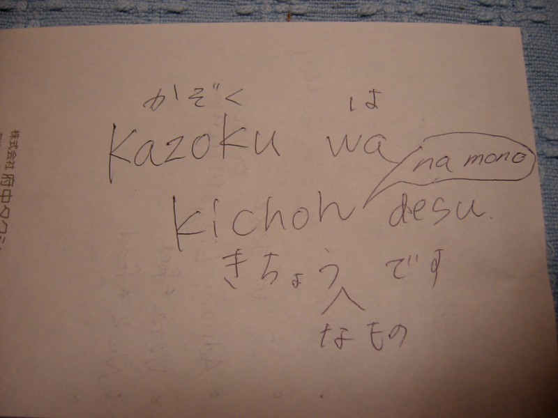 22:37:42 Being that it was Christmas, I wanted to learn how to say "family is precious" in Japanese. Apparently, it goes something along the lines of "Kazoku wa kichoh na mono desu". |