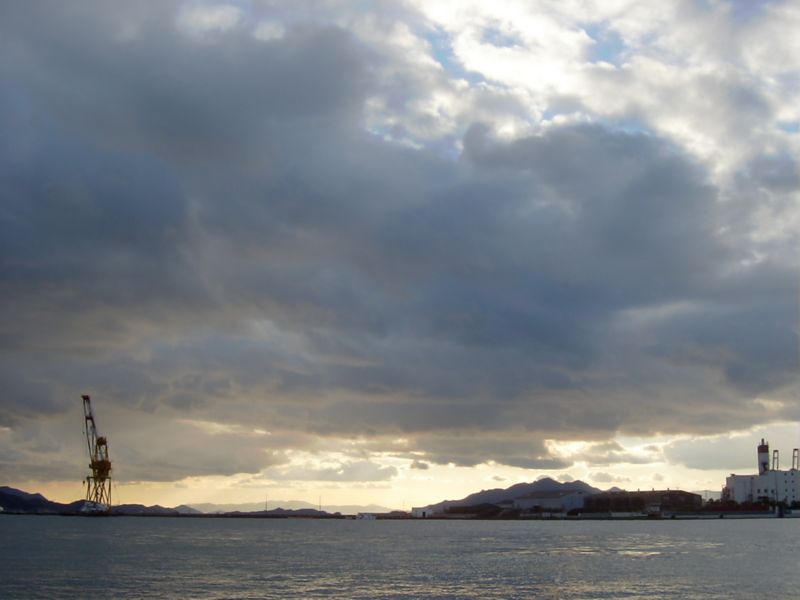 16:28:49 I like the layered effect of the mountains on the horizon in the middle of this picture, and the way the smoke and steam from the ships is highlighted by the sun. |