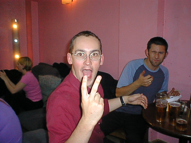A group of Leon's friends (and me) got together on Thursday 13th July 2000, in a Slug and Lettuce pub in central London to say goodbye to Leon, who was leaving the country for a couple of years to work in Japan and travel around the far east. These pictures were uploaded over three years after the event, having lurked in the dark recesses of my hard drive unseen for all that time. As such, the comments aren't very informative, as I couldn't actually remember the evening that well!