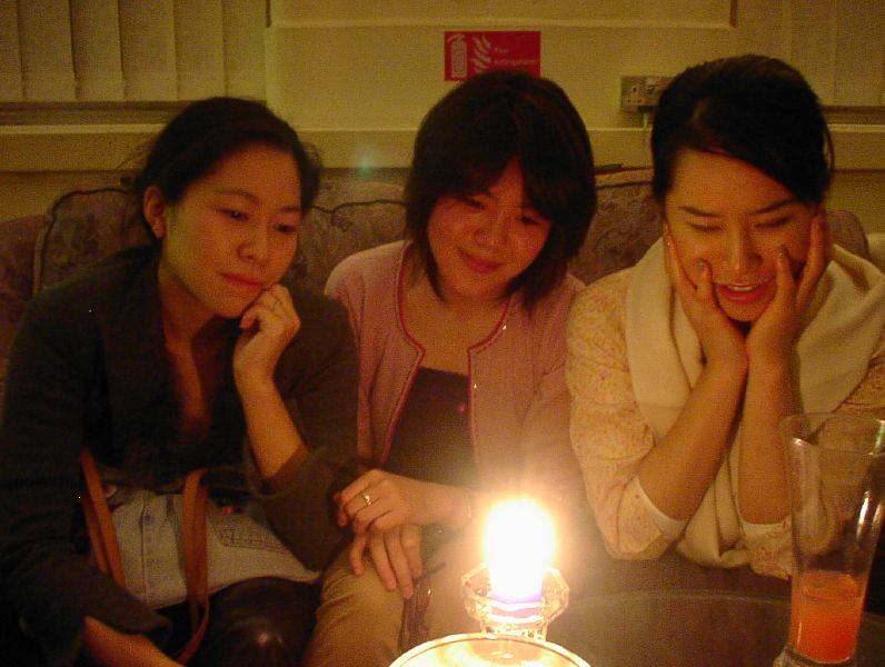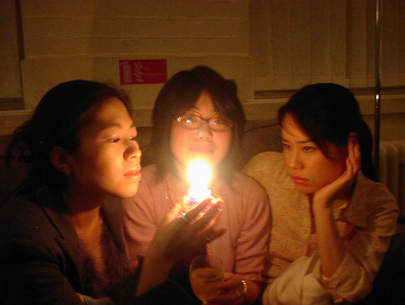 22:30:39 Here begins a series of attempts to get an "arty" picture, with the three girls and some candlelight... |