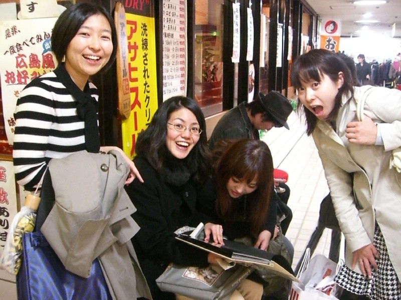 ...oh and another one outside the restaurant taken while we waited for a table. The girls here are looking through a photo album Hide-san had made for us as a wedding present.