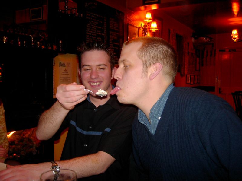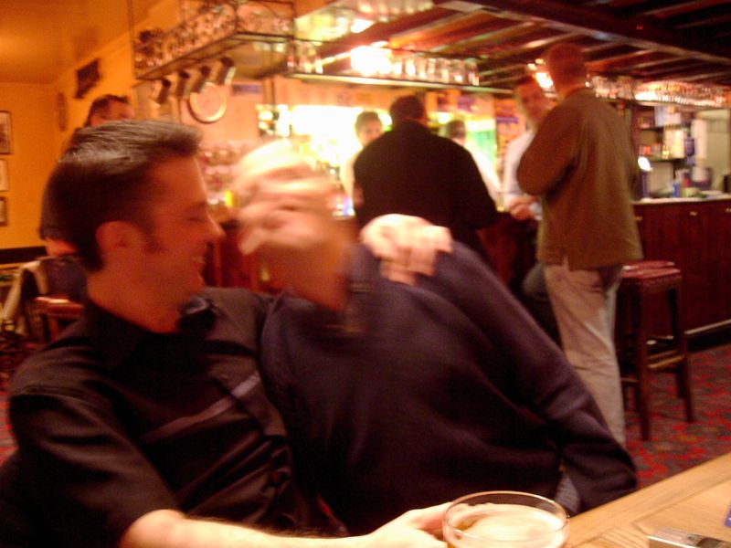 19:11:16 Clearly by this stage though, drunkenness had overcome politeness, and the flash was on again. A particularly touching shot of Jim and Barry. |