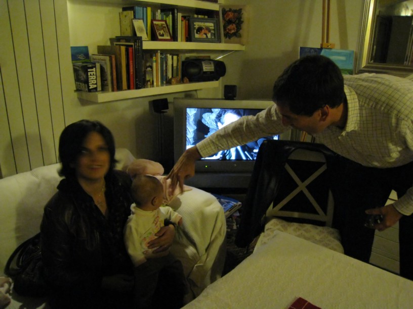 Angela, Giulia and Ivan trying to stop Giulia from watching TV. |