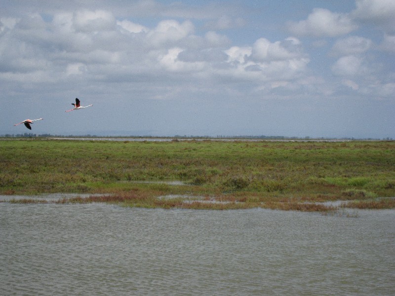 | 17:24:13 Algues Mortes is right into Camargue surrounded by swamps in the winter... | 18:55:58 Pink Flamingos flying aginst the sun! YES!! | 19:09:57 Some horses and bulls on parade, Camargue is full of them and the roam freely |