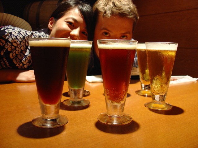 Friday 01:45 Aaaaaa marvellous 6 pints of beer, brewed onsite (apparently). The green one is a mix of beer and macha (green tea), I was not impressed by it... |