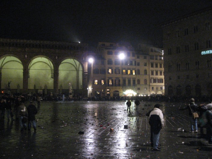Piazza signoria after midnight. The idiots that go there every year cannot find better than throwing bottles in the middle of the square (breaking them) and creating a very nice glass shards carpet... |